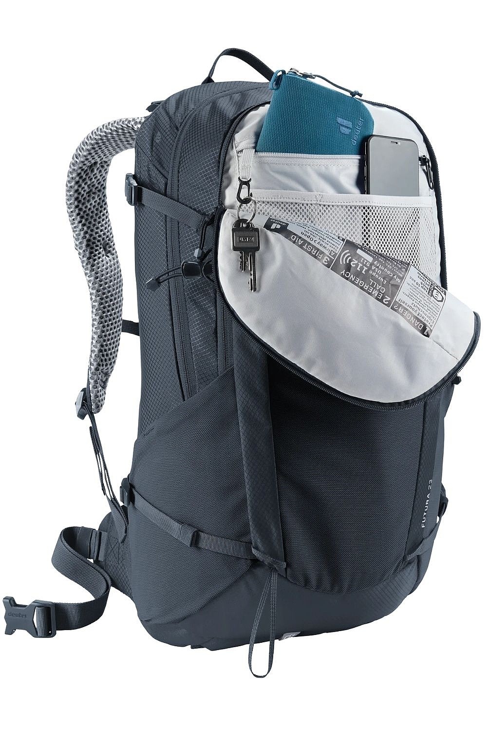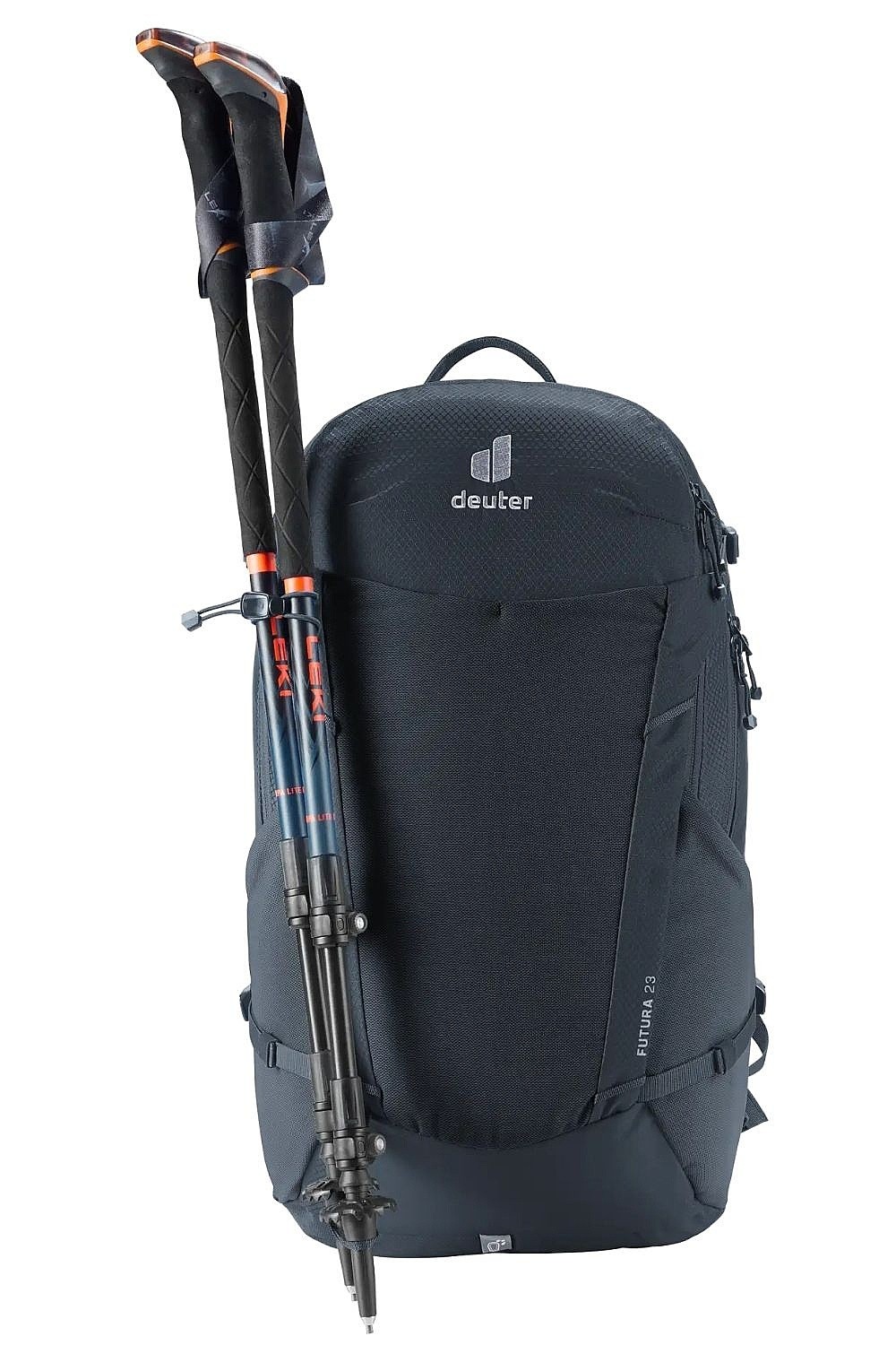 Plecak turystyczny Deuter Futura 23 – wykorzystuje system nośny Aircomfort z paskami naramiennymi ActiveFit oraz pasami biodrowymi z regulacją Pull-Forward, zapewniającymi optymalne przenoszenie obciążenia, równomierny rozkład ciężaru i skuteczną wentylację. Z praktycznymi kieszeniami z elastycznego materiału na zewnątrz oraz kieszeniami na pasach biodrowych na przedmioty, które chcesz mieć pod ręką podczas jednodniowej wycieczki. Ponadto oferuje możliwość zamocowania dodatkowego sprzętu turystycznego, takiego jak kijki itp.